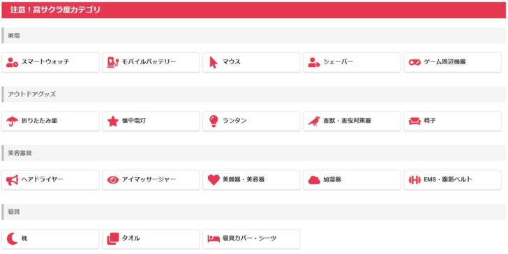 サクラの多い要注意な商品ジャンルを一覧で教えてくれている箇所もあります。